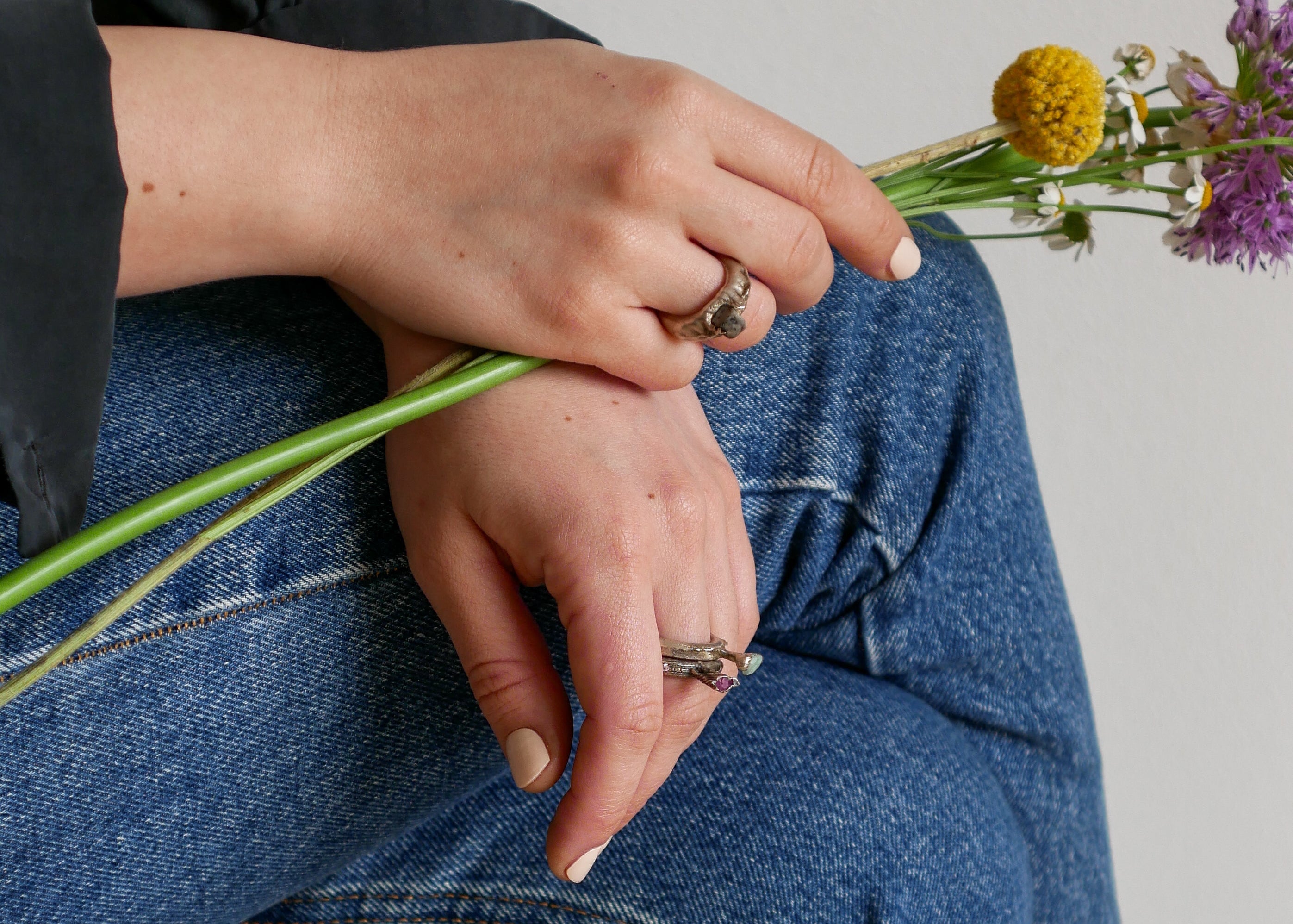 Nella collezione Talismani troverai pezzi unici realizzati con pietre upcycled incluse nell'argento fuso. Gioielli astratti che colpiscono direttamente all'anima.