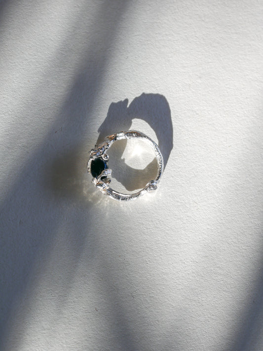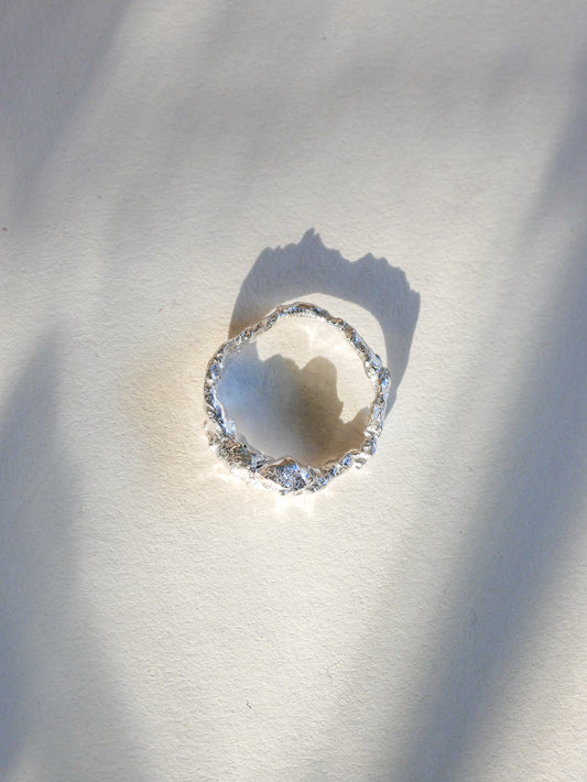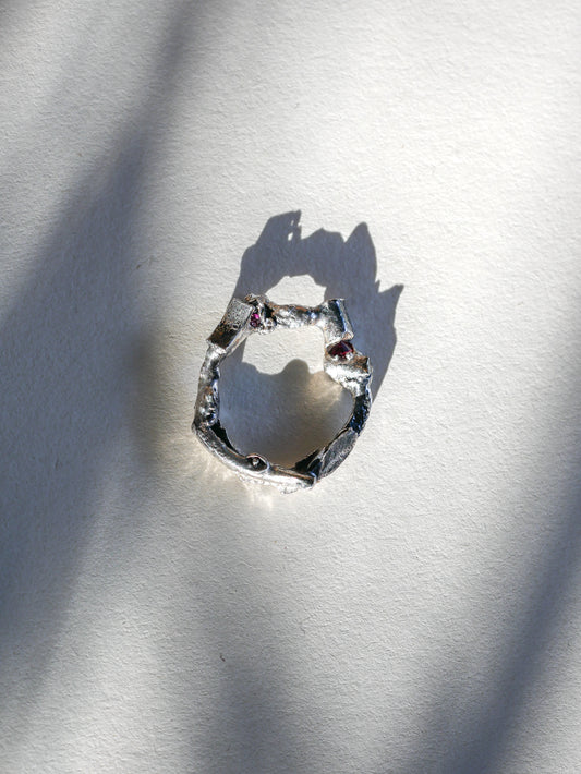 Ciò che rende questa collezione significativa è il processo di creazione. I pendenti e gli anelli vengono realizzati fondendo l'argento recuperato da materiali di scarto. L'argento si unisce alle pietre preziose, durante la fusione del metallo.